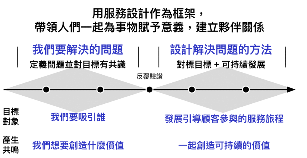 服務設計是一個以人為本的方法論,它幫助我們不只是設計單次的活動,而是設計一條完整的顧客旅程,從旅行前、旅行中到旅行後,逐步建立顧客的參與感與忠誠度。