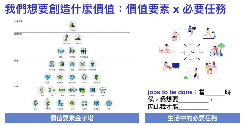 在找到潛在的顧客對象後,我們可以借助兩個強而有力的方法工具:價值要素金字塔(Elements of Value Pyramid)與必要任務(Jobs to Be Done),協助我們把抽象的「價值」與「需求」具體化。