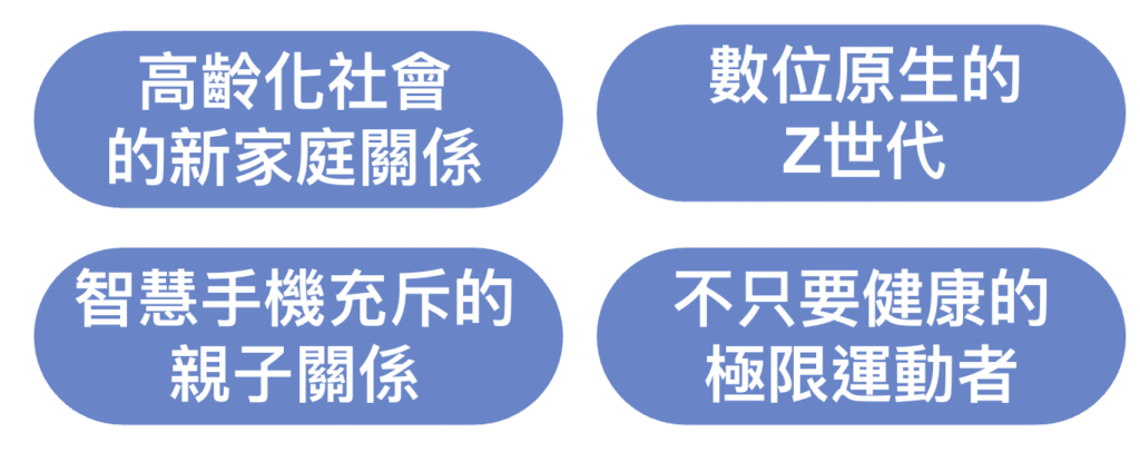 下圖整理的一些從趨勢所看到的潛在客群:高齡化社會中的家庭關係、數位原生Z世代的生活樣貌、智慧手機充斥的親子關係、以及想嚐鮮的極限運動者等。這些脈絡都可能成為潛在的顧客來源,幫助我們打開新的可能性,再進一步驗證是否能夠轉化為真實的價值。